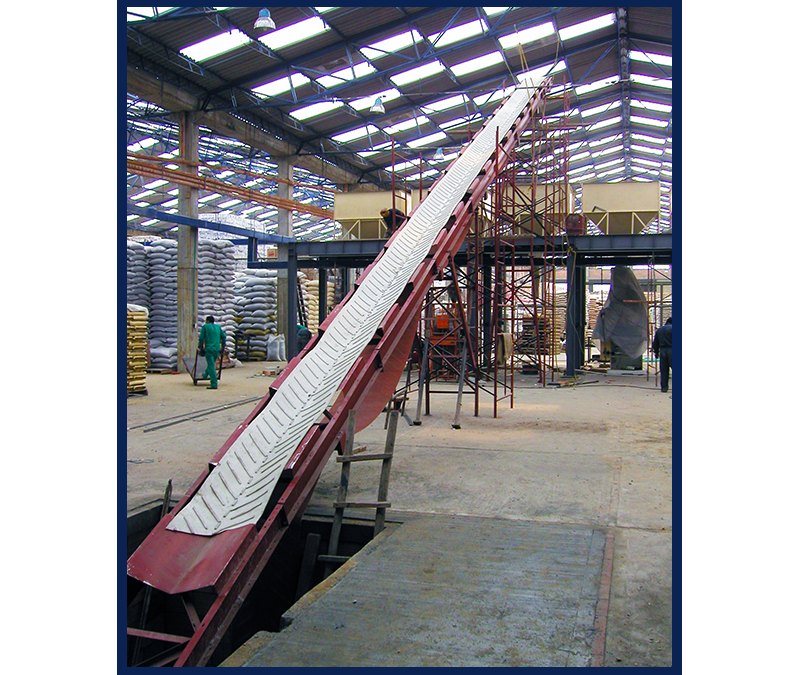 Diseño, fabricación y montaje de transportadores de banda y de gravedad por rodillos para manejo de materiales empacados (bultos, canastas, cajas, etc) y a granel (arena, cemento, granos).